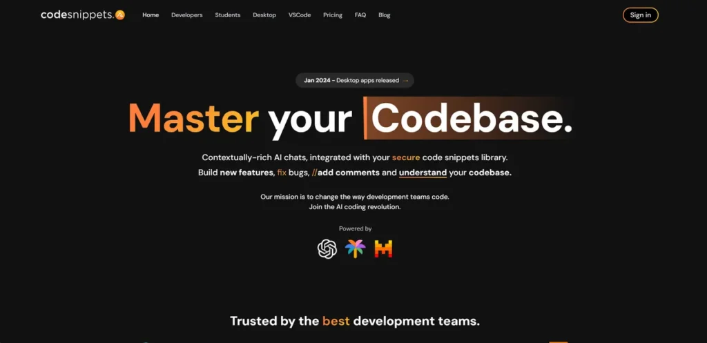 In the professional software development landscape, efficiency and codebase integrity are paramount. Code Snippets AI presents itself as a specialized tool designed to address these core requirements. It functions as an AI-augmented code snippet library engineered for development teams. The platform’s primary objective is to streamline the development lifecycle by creating a centralized, secure repository for reusable code. This library is then integrated with a context-aware AI chat, allowing developers to query their own codebase, generate new features, debug complex issues, and onboard new team members with significantly reduced friction. It operates across multiple platforms, including dedicated desktop applications and IDE extensions, aiming to become an integral part of a team’s existing workflow without compromising security through end-to-end encryption.