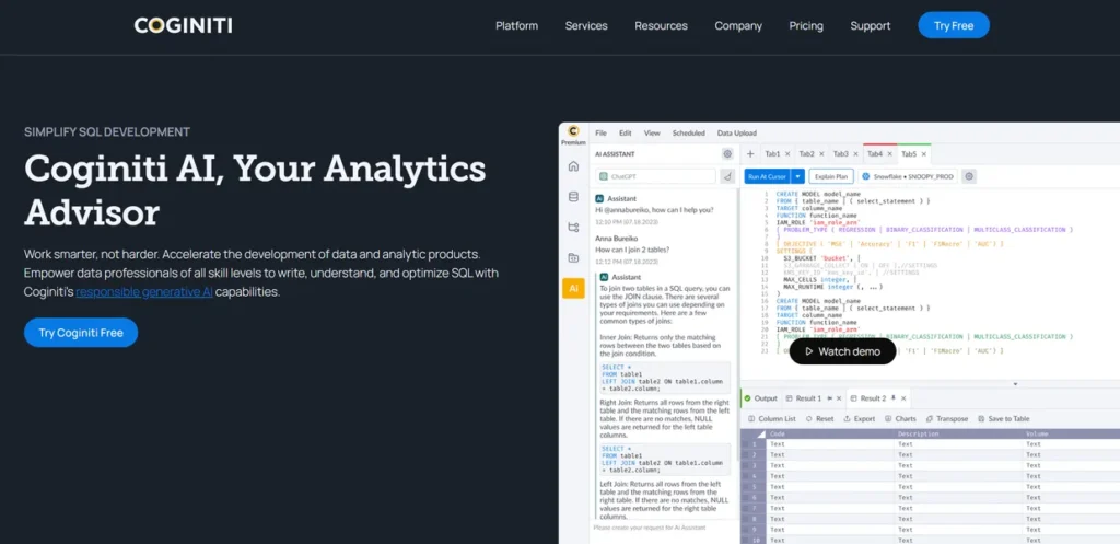 Coginiti is an AI-driven data and analytics platform designed to act as an intelligent advisor for SQL development. For fast-moving marketing managers, this isn’t just another data tool; it’s a strategic asset for accelerating the journey from raw campaign data to actionable intelligence. In a world where campaign success hinges on speed and precision, Coginiti empowers marketing teams to write, analyze, and optimize SQL queries with unparalleled efficiency. It effectively bridges the gap between complex datasets and the clear, timely insights needed to refine targeting, measure ROI, and drive lead generation. By simplifying data workflows, the platform enables marketing professionals to spend less time wrangling data and more time making informed decisions that impact the bottom line.