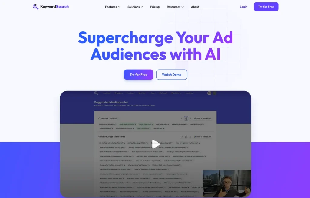 KeywordSearch is a specialized platform that leverages AI and machine learning models to optimize digital advertising campaigns within the Google and YouTube ecosystems. From a technical standpoint, it functions as a service layer that automates and enhances complex data analysis tasks historically performed manually by marketers. By processing user-provided business data and market signals, the platform generates structured outputs—such as highly segmented audience profiles and semantically related keywords—designed for direct deployment into Google Ads. It serves to increase the efficiency, precision, and scalability of ad campaign creation and management by minimizing manual data handling and leveraging algorithmic insights.