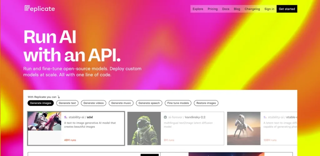 - Automatic Scalability: When a model’s API endpoint receives requests, Replicate automatically provisions the necessary GPU resources to run the inference. It scales resources up to handle high traffic and scales down to zero when idle, which is a key component of its usage-based pricing model.