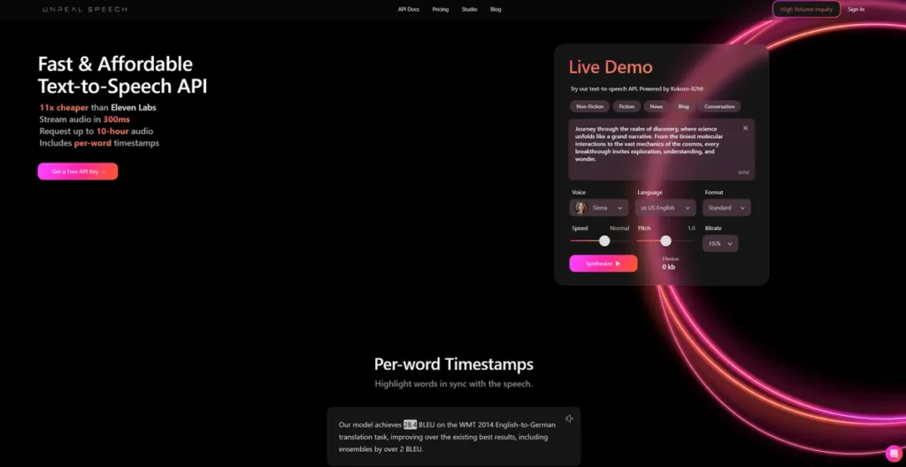 - Reduced Production Overheads: By eliminating the need for voice actors, studio rentals, and sound engineers, Unreal Speech offers a highly cost-effective solution for creating professional-quality audio at scale.